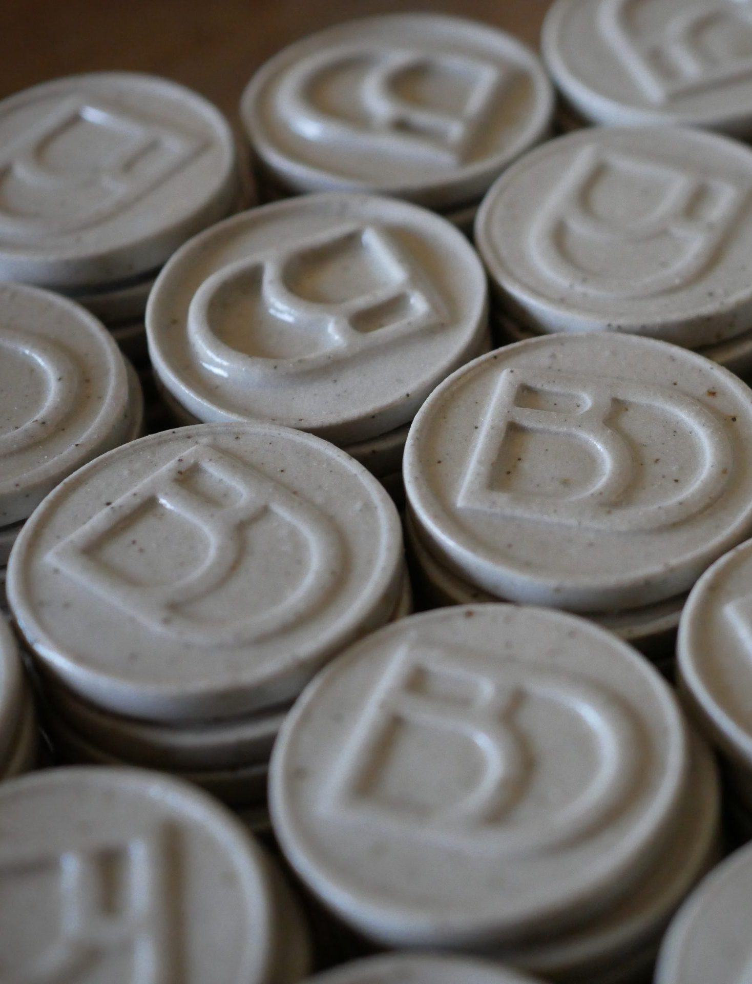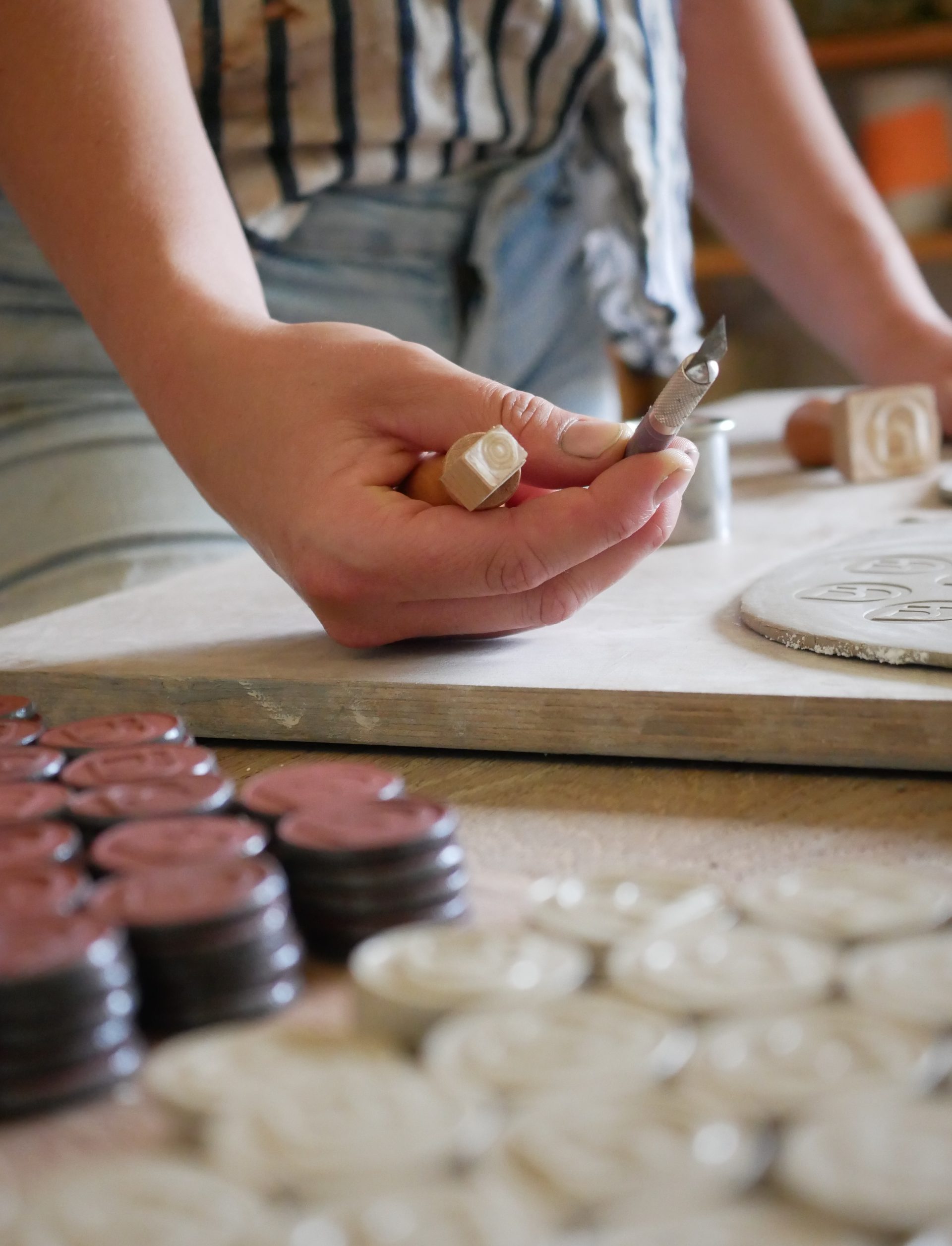 Chaque pièce est fabriquée entièrement à la main, localement, dans l’atelier Dijonnais. Les argiles qui composent les fèves sont issues de carrières françaises, et sont naturelles.